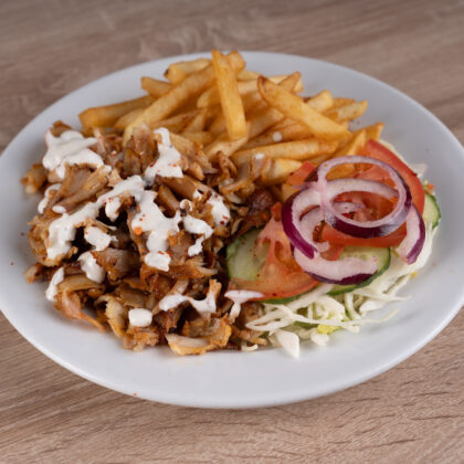 Csirkés kebap tál hasábburgonyával